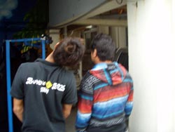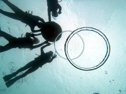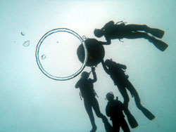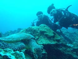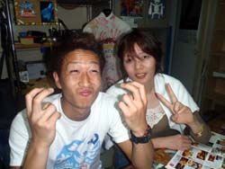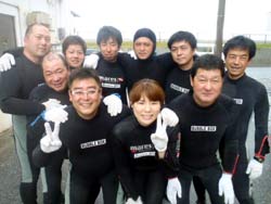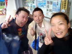 はいこんにちは!!タクです、よ。天気は晴れ!!ケラマへGOーーー♪♪メンバーはタカシさん&アキ君。アキ君、ケラマで初のカメを見るべく、気合い満々です!!!タカシさんは・・・日焼けに気合満々です(笑)行きの間は2人とも上裸で太陽に当たりながら爆眠・・ZZZ。さ、到着して一本目は〜トウマです。ガーデンイールやカクレクマノミ、アジの群れやデバスズメダイ、けっこう生物が多かったですな。2本目は、え〜・・・砂地です、アキ君(笑)ドラゴンレディーです。スカシテンジクダイとかユカタハタ、アカシマシラヒゲエビ、最近人気のカエルアンコウもいました。しっかし2人ともエアーの減らないこと!90か100は残りましたね。お昼時間は3人で船から飛び込んだりして遊んでました。その時の写真が右のヤツです。ラスト一本はアリガー!カメを信じて・・・エントリー!!いたーーーーーーーーー!!!!!!でもアキ君気付いてなーーーーーーーい(笑)鈴鳴らしまくり!!!・・・けっこう近くで見れたね^0^良かった。その後は浅場を泳いで、そしたらまたカメがいて、何気に二回も見れたね!!!アキ君、いい締めくくりでケラマを去ることができましたね。帰りの船では思いっきり水かぶってたけど(笑)さ、ステーキ食いに行きましょうか!!! |