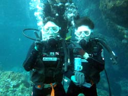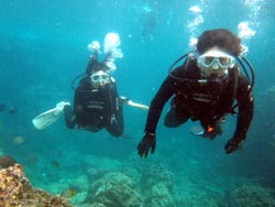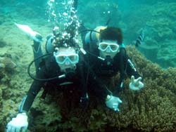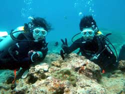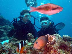 はいさ〜〜い、鼻矢印せーやです!!今日はほんと朝から雨がざーざー降ってますが、ダイビングもちろんしてきましたよ!今日一緒に潜ってくれたのは、茨城県からお越しの2人組み☆エリピは海外で2回潜ったことのある経験者で、ナオピは今回が初ダイビングにチャレンジしてくれました^^ナオピはやっぱり初めてだったので始めは少し緊張気味でしたが、海に入ったら全然大丈夫で2人ともお魚に夢中でしたね♪そんな2人からコメントもいただきました。 ナオピ「初めてのダイビング緊張しましたが、ご指導のおかげで最後まで潜ることができました。ありがとうございます。それにとても楽しかったです。わたしは沖縄に来る機会が多いのでまた潜りたいと思います。その時はよろしくお願いします。本当楽しかったです。いい思い出になりました☆☆せいやっちありがとう☆☆」 エリピ「沖縄ダイビング初でした!!知人から海外潜るより沖縄いった方がいいと聞いていて念願を果たすことができました。せいやっちはお会いする前から電話でとても親切に教えていただいて分かりやすく助かりました。天気には恵まれませんでしたが、海もキレイだし魚のエサあげもできて、思い出に残る一日でした♪次回は快晴のときにやってみたいです^^またお願いしまーす!!」 |