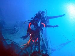 はいさい!!ひろあきです!!今日は久しぶりに古宇利島へ行ってきました☆もちろん古宇利島のポイントといえば「エモンズ」です^−^ゲストはBB滞在数日目のたかしさん!!そして初エモンズのりょうけんと3人で行ってきました。この時期は人が少なく僕たちだけの乗船でしたが船長さんが出航してくれました。ありがとうございます。心配していたうねりと流れはほとんどなくロープをつたってスイスイと船へ潜行!!やっぱり迫力あります。。。でかいです。。。感動です・・・。一本目は船の大砲や船首側に泳いでいってタイタニックのマネをしたり砲台から発射するようなマネをしたり(笑)珍しい魚もスルーして船にくぎ付け!!でも楽しい時間はあっという間ですぐに浮上開始しました。そして休憩をとって2本目は船尾から潜行開始!!俺たちの2倍以上あるプロペラを見たり大きい魚雷を見たりとしっかりと目に焼き付けてきましたよ〜^−^潜り終わったあとはせっかくの古宇利島なので島を一周して名護でカレーバイキングを食べて帰ってきました。カレーを食べすぎてみんなグロッキーになりましたが・・・(笑)なかなか行けるポイントではないので今回行けてラッキーでしたね♪また機会があったら行きましょう!! |