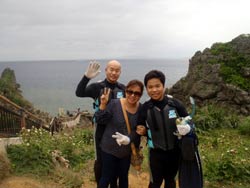 こんにちわJackです^^☆本日1発目は2組み合同での青の洞窟スノーケルに行ってまいりましたぁ!!まず〜家族旅行で沖縄に来ているりゅうじさん&みなさん&れき君の3名でーす!!続きましては、2人仲良くゆったり沖縄旅行中の、たかひろさん&さきこさんの2人でーす!!ついでにジャックも入れての6人で遊んで来ましたぁ^^♪GW突入と言うこともあり真栄田岬も賑わってきていて、洞窟内も人でかなり賑わっていました!!洞窟へは、まず岩場を歩いて探検隊になりながら向かいました!!洞窟もキレイに見れて良かったでーす!!楽しい時間は、あっと言う間でしたね!!みんなから感想頂きました!! みなさん:すーっごく楽しかったです。また絶対きます!! れき君:怖かったけれど楽しかった。うれしかった。 りゅうじさん:見た事ないくらいキレイでした。日本一の海です!! たかひろさん:気温が低く水の中も寒いと思っていたがウェットスーツも暖かく海も魚もキレイで、とても良かった。親切に教えてくれてよかったです。ジャックさん、ありがとう。 さきこさん:青い洞窟が、すごく感動しました。気持ち良かったです。ジャックさんありがとう☆説明も丁寧で解かりやすかったです☆☆ |