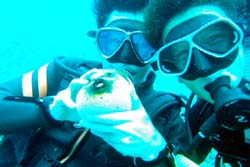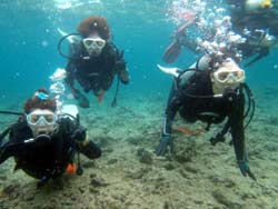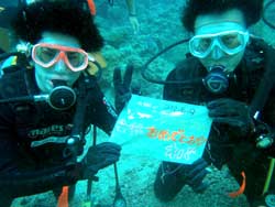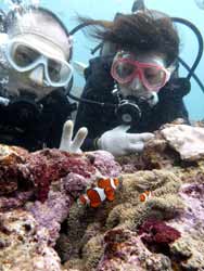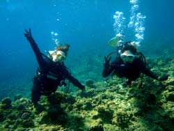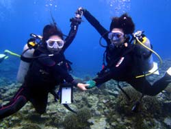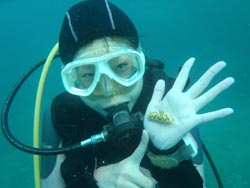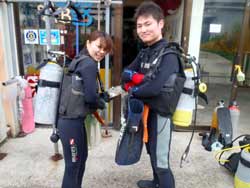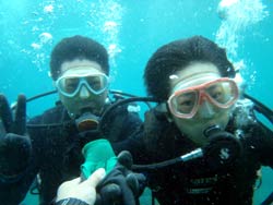 まいど〜ひろあきです^−^今日は砂辺で体験ダイビングを担当しました☆遊びに来てくれたのはファンダイブで遊びに来てくれている加藤さんのお友達でたけちゃんとハルちゃんです!!2人とも初めてのダイビングでしたがとっても上手!!ニモを見たりやわらかサンゴを触ってもらったり大量の魚に撒かれたり・・・^−^水中世界を満喫してもらえました☆ ハルちゃん:今日は楽しい体験をさせていただいて、ありがとうございました。始めの方は上手くいかず戸惑ってばかりでしたが、ゆっくり丁寧に教えてもらえました。いい思い出ができました。 タケちゃん:初のダイビング経験でしたが、楽しい時間を過ごせました。インストラクターのヒロ君もとても優しく接して頂き、ありがとうございました。是非、またダイビングをやってみたいと思います。一発芸、最高でした!! |