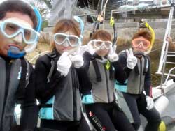 はいはーい!ども、りょーけんでっす。今日はFUNダイビングに行って来ました〜!今回一緒に海に行ったのはながPの紹介でやってきたさきちゃん、たかちゃん、ゆきちゃんの3名!このメンバーでゴリチョへ潜りに行ってきました〜。前回のダイビングからちょっとブランクがありましたが、特に問題なくスタートできましたね!みんな初沖縄でのダイビングだったので水中で記念撮影をやったり、定番のクマノミたちを見たりしてきました。途中でスカシテンジクダイの群れがいたり、それを狙うハナミノカサゴ達を見たりとおもしろいものが見れましたね。また次回沖縄に遊びに来る時はながPと一緒にゆっくり潜りに来てくださいね〜!! |