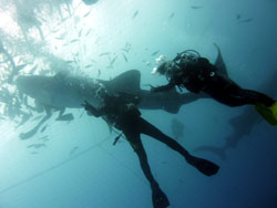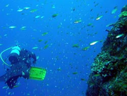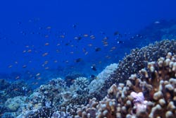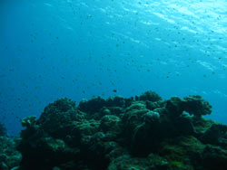 はいさい!今日はケラマでドリフトダイブです。参加してくれたのは、ゆきちゃんとなつきちゃんです。お日様カンカンではなかったけど、面白かったよ〜〜!1ダイブ目は、ゴブリン?です。地形ポイントで岩の間なんかを楽しみましたが・・・さ、魚がいませんでした・・・岩の間からキラキラとキレイで透明度最高でしたね。それよりも結構流れていたことの方が印象的かな?2ダイブ目は、ウチザンショウでは、大きなネブリブカが5匹泳いでいたので皆でビックリしながら近づきました。ノコギリダイやアカヒメジがキレイでここでは2人は初アンカードリフトです。ばっちり上手く出来ました。めっちゃ大きなローニンアジが一匹居たんだけど・・・見たのは俺だけでした・・・残念!3ダイブ目は、皆のツインロックです。ここでもアンカードリフトです。流れは止まり、離れ根をゆっくりと一周しました。キンギョハナダイやハナゴイ、カスミチョウチョウウオなどキレイでしたが、大きなイソマグロが近くでグルグルしてくれたのですごかったです。その後小振りではあったけど、10匹ほどのイソマグロやカスミアジなど見て最後根から離れる時にはまたまた大きなネブリブカを見ることが出来て今日は最高でした。バッチリ練習してまたドリフトダイブ楽しもうね!!二日間お疲れ様でした。また遊びに来てね!待ってるよ!! |