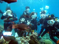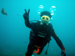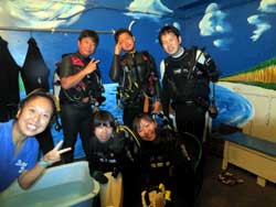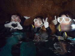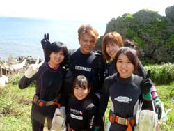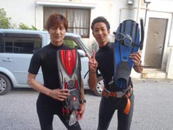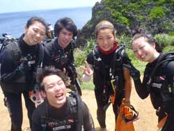 はいさ〜〜い、せーやです!!今日も天気予報をくつがえすいい天気でしたね☆そんな天気の中一緒に潜ってくれたのは、今日到着でOW取りたてのまみさんと、沖縄在住のなっちゃんと今日講習ラストのマエカズとオバちゃんの4人です!!みんなまだまだ取りたてや講習中ということでマエダの海をゆっくり泳いで行きました。青の洞窟もいきましたが、人の多さにびっくり!!でもみんなで眺めてきもち良かったネ☆講習の方からコメントも頂いてまーーす!! まえかず☆とったどぉーー!!オープンウォーター!!体験ダイビングから時間が少し経っていたので緊張していたけど、りょうけんさんもせいやっちもみんな良い人で安心して海に潜る事が出来ました。本当に感謝しています。日々の仕事のつかれがリフレッシュする事が出来ました。ありがとー沖縄!!また行くよぉーー! おばちゃん☆初めテキストを読むだけではイメージがつかず、不安な部分もありましたが、インストラクターの人が親切に分かりやすく教えてくれたので楽しく学ぶ事が出来ました。初日は少し寒かったけど水中で魚みたいに泳げる感動感でいっぱいでした。最終日には真栄田岬の青の洞窟も見る事ができて大満足です!! 次回またみんなでダイビングしよぉーーねぇ。ありがとう!! |