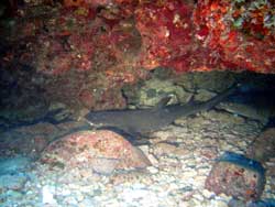 こんばんは、これから夜の街・・・じゃなくて夜の海へ行ってきます、タクです。メンバーを紹介します!今日からAOW講習のポーちゃん&マメちゃん、グルメハンターつっちゃん、飛び入り参加の我等がスーパーひとし君!以上のメンバーで参りました♪皆で一列になって、チェーンをつかんで出発!さっそくエビ、カニがゴロゴロでてきてました。ドロップを降りて集合した後、足元を照らしながら行くと、大きなモクズショイがいました。腕に登ってきたりしてカワイイ奴です^0^他にも、クロガシラウミヘビが寝ていて、近づくと起きて寝ぼけながら泳いでました。つっちゃんに寄っていったのはウケた(笑)つっちゃんも必死に逃げてたし(爆)その後にも。オトヒメエビや寝てるアイゴ、最後には夜光虫もたくさん見れました〜〜☆最後も皆仲良く一列で帰ってきました。楽しかったねーーー!!では、明日に備えて、飲みますか!! |