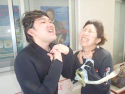 ちゃーーーっす!タクです。さ〜〜今日は真栄田でFUNダイビングです☆今回は三年ぶりのリピーターさんの、藤本さん&飛び込み参加の沖縄在住タカさん。天気良し、海況良し、一本目は洞窟へ。洞窟の中は、今が旬のリュウキュウハタンポ軍がスタンバイ!!オトヒメエビや、アカマツカサも見れました。帰りも小さな生物を探しながら、藤本さんのNEWカメラでバシバシ撮ってもらいました☆休憩をはさんで、二本目は30MオーバーのDEEPの世界へ・・・。もちろんハゼ狙いで!!いましたよーーヤシャ、ヒレナガネジリンボウがワサワサと。戻るときは、ツバメの根を一番下から見上げてアースを感じながらのんびりと・・・。あ、ヒラヒラと踊ってるオドリハゼも発見できましたよ!エキジット前には俺とタコが格闘になったりして、それ見て藤本さん大喜び(笑)タカさんも応戦してくれました。とまぁ〜こんな感じの今日でした♪次回はタカさんもカメラ持ってきてくださいね(^^)ではまた!!! |