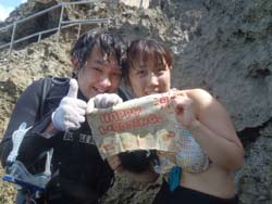 はいっは〜い!ども、りょーけんでっす。午前の体験ダイビングは続きますよ〜!今回一緒に潜ったのは飛び込みでやってきたトモキングとなっちゃん!この2人と青の洞窟まで行ってきました〜。2人ともダイビング初挑戦で特になっちゃんが不安な感じにしてましたが、陸上と水面でゆっくりと練習を繰り返したら、問題なく潜ることが出来ましたね!水中に入ってみたら元気いっぱいに泳いで洞窟まで・・・。洞窟のではリュウキュウはタンポの群れを見たり、振り返って見た入口の青をじっくりと観賞してきました!帰り道ではクマノミとの写真撮影や魚への餌付けのほかに、今回間も無く誕生日を迎えるなっちゃんに誕生お祝い!渡された時はビックリしてましたね〜。今回2人からのコメントを頂いているので掲載します! トモキング&なっちゃん:天気があまり良くない日が続いていたので、海で遊べるか心配していたけれど潜れてたくさんのお魚たちと遊べてすごくすごく楽しかったです!!すてきなBirthdayメッセージもありがとうございます。25歳最後の日とってもステキな日になりました〜!! 以上です。また来年も沖縄に遊びに来て海の中に潜りに行きましょう〜!! |