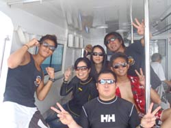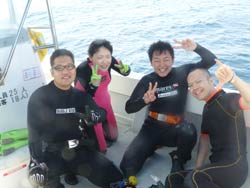 はいさ〜〜い、せーやです!!今日もいい天気で気持ちがいいですな〜〜☆そんな日はやっぱりケラマ行っちゃいますか??行っちゃいましょう!!一緒に行ってくれたのは、最近月一でBBに来てくれている川ちゃんと同じ同期のギャバンと天然ともちんの3人とファンダイビングしてきましたよ♪一本目はギシップ島のサントラでカメを探しにドンブラこドンブラコ。エントリーして5キックぐらいしたら速攻見つかりましたが、足が片方無くなっていてみんなで追いかけるから嫌そうな顔をしていましたね^^砂地も太陽の光で泳いでいて気持ちがいいです。二本目は知志に行ってきましたが、やっぱりここも天気がいいと穴を抜けた後のクレパスに降り注ぐ光がとっても青く輝いていました☆最後安全停止でのみんなで乗っかりあって写真を撮りました!最後は激流の男岩でドリフトダイビング!!いや〜〜ほんと激流!!マジで流されまくりで周りを見ててもなかなか大物はでない。。。流れが強すぎもやっぱりいないですね。。。でもみんな必死な顔も今日のお酒のつまみになり今日は騒ぎましょう☆ |