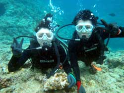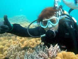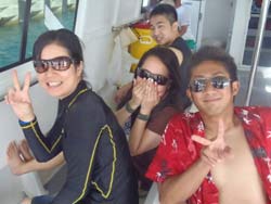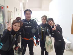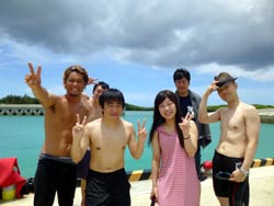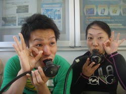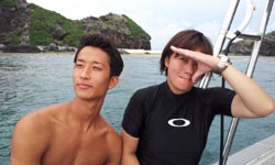 続いて二組目は〜東京からお越しのワカちゃん、トリちゃん。初めてダイビングで少し緊張気味でしたが、全然よゆ〜って感じで海の中に入れました☆今回はBコースだったので、近場をグルリとまわり、海底が見えないくらい深いところの上を、空を飛ぶ感じで泳ぎました(^^)最後も自分で泳いでのんびり癒されました。次回はライセンスかな??笑)最後に感想を載せます。 とりちゃん☆たくちゃんが上手くリードしてくれたので初めてでもとても楽しめました。沖縄に来たらまた是非よろしく!! わかちゃん☆今回初沖縄で、初ダイビングを体験しました。最初は不安でガチガチだったけどすぐにリラックスして夢の世界へ連れってくれました。現実逃避したくなったらまた遊びに来ます。オススメです。 |