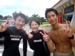 どーも、今日もたくさんのお客さんを海に連れていきましたよ〜〜☆今日一緒に行ってくれたのは、午後から来てくれた林さん親子のゆうちゃん&みっちゃんの2人!!天気がいいので浅瀬は真っ青♪キラーーん!2人は最初緊張しつつも練習でゆっくりしたらだいぶ慣れて上手にスイスイ泳いでましたよ〜〜!今日は宇宙を感じると言うことで少し沖に出て深いところをがっつりみてきました☆2人からもコメントいただいておりまーす! ゆうちゃん:魚たちがとてもかわいかったです☆不安でいっぱいだったけど、体験できて良かったです。スタッフの皆さんとせいやっちがとても分かりやすくやさしく面白くして下さったので、それがとても嬉しかったです☆たくさんたくさんありがとうございました☆☆☆ みっちゃん:53歳にして念願の“海の中の遊泳”ができて最高の1日でした。ハードなところもあったけど(鼻に水が入ったりタンクが重かったり)ひとつひとつ親切に指導して頂いたおかげで、途中リタイヤせずに楽しくもぐれました。せいやっちさんありがとうございました。 |
