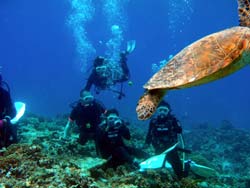 はいはーい!ども、りょーけんでっす。今日はAOW講習+FUNへ行ってきました!今回一緒に潜ったのはAOWダイバーになったゆきちゃんとFUNダイバーのやっちん!この2人とケラマへ行ってきました〜。まず1本目はボート講習で野崎へ!ここではメインのサンゴの根をぐるーっと周ってデバスズメダイの群れをじっくりと見たり、突っ込んだりしたあとカメを探してあたりをうろうろしてみました!残念ながらカメは発見できずでしたが可愛いハリセンボンを捕獲することは出来ました(笑)続いての2本目はじつるでドリフト講習!所々流れが強かったのでキンギョハナダイやハナゴイ、カスミチョウチョウオなどの群れを見ながらぴゅ〜っと流されてみました!途中でイソマグロと遭遇するレアなこともありましたね。そしてラストはコーラルガーデンへ!ここではリクエストのカメ探し。入ってみてカメが居るのか不安になる雰囲気が漂ってましたが、なんとかアオウミガメを発見!ゆっくりと泳いでいて近づいても逃げなかったので横を一緒に泳がせてもらいました〜。またケラマへ行って今度は数え切れなくなるくらいのカメを見に行きましょうか〜!! |