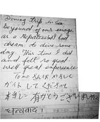 どうもともです。今日は飛び入りニモに会おうお花畑で体験ダイビングに遊びに来てくれたのは、な、なんとネパールから遊びに来てくれた、お茶目な女性のスバです。「すば〜!きょうは、ありがとうございます。たのしめましたか?うみのないねぱーるからありがとうね。またきっとあそびにきてください。あおいあおいおきなわのうみでまってるよ。しゃしんをみんなにじまんしてくださいね。」そんなスバから英語でコメントを貰ったので写真で紹介です。 スタッフのコメントは少々お待ち下さい