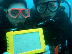 ども、タクです。明日から台風でグチャグチャになる前に、砂辺で体験ダイビングにレッツラGO〜です♪今回は、大阪からお越しの女子2人組と一緒に行ってきました。ミオちゃんはド緊張しまくり(笑)練習もテンション低め。ガッキーの方はいい感じで練習スイスイ♪ミオちゃんのテンション上げながら、いざ出発(笑)・・・むむっ?!ミオちゃん、全然上手じゃないか〜〜〜い!!!とゆーことで、なんの問題も無く、ガッツリ泳ぐ事ができました(^^)良かったね〜〜(笑)そんな2人から感想をもらってます。 ガッキー☆初めてのダイビング、めっちゃ楽しかったです。海がキレイで潜って気持ち良かったです。深くなるときに、耳が痛くなったけどゆっくり行ってくれたので、あわてずにできました。大丈夫と思ったけど、結構痛くなってビックリしました。友達のほうが平気そうで、さらにビックリしました(笑)サンゴとか触れて楽しめました!!ありがとうございました。 ミオちゃん☆最初は、本当に恐くてどうしようかなと思っていたんですが、受付してくださったお姉さんも、インストラクターのお兄さんもとても明るく親切にして下さって、途中からだんだん楽しめるようになってきました。私はほとんどバタ足ができずにひっぱってもらってばっかりでした。でも10mの深さまで行けて嬉しかったです。今日入らなかったら、一生見るとのない世界かなと思います。ありがとうございました。 |