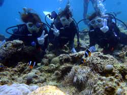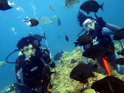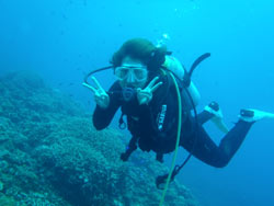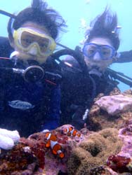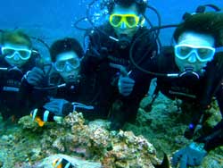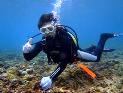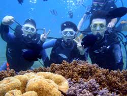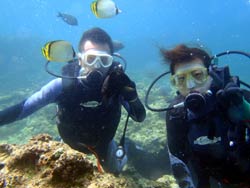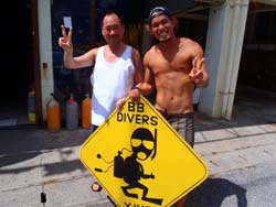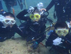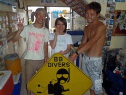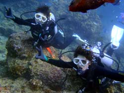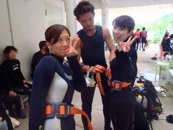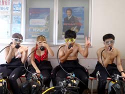 はいはーい!ども、りょーけんでっす。今日は体験ダイビングに行ってきました〜。今回一緒に海に潜ったのは中国からやってきたしんちゃんとわんさん!この2人と砂辺の海に入ってきました〜。2人ともダイビング初挑戦でかなり緊張した様子でしたが、しばらくすると慣れてきて回りの景色を楽しんでいましたね!やわらかいサンゴを触ったり、ニモとの記念撮影や魚達への餌付けをして楽しめましたね。 わんくん:初めてのダイビングで、とても楽しかったです。正直に言って、最初は怖かったです。耳も痛いし波も激しいし、でもスタッフさんがとてもやさしく、私達をつれて少しずつ進めていく中、恐くなくなって水中の楽しさを感じました。またチャンスがあれば、もう一度やりたいです!!その時はよろしくね^^!! |