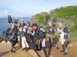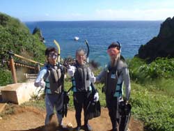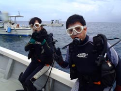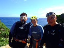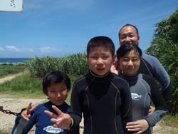 はいさいひろあきです!!今日は朝から青の洞窟体験ダイビングを担当しました!!遊びに来てくれたのは元気な3名様でした^−^中国から夏休みを利用して来てくれた一余君も元気にダイビングを楽しんでいました^−^台風前にみんなで一緒に写真をとったり海に入れて良かったです☆また是非遊びに来てくださいね☆ 熱帯魚を間近で見れて楽しかったです。しかし海は楽しい反面怖いということも分かりました。船酔いに似た感覚を覚えいっっぱいいっぱいになりました。妻をもう少し水に慣らしてから再度チャレンジするかも知れないのでその時はよろしく!」 |