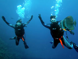 さー今日はまマエダ祭りですよ〜。天気も晴れてダイビング日和になりました(^^)そんな今日、広末さん夫婦が参加してくれました♪2人とも初めてダイビングでしたが、ぜんぜん上手に泳いでました(笑)洞窟もキラキラ輝いてました☆魚もワッサワッサ寄ってきて、写真はほぼ魚だらけですよ(笑)しかも午後からはパラセーリングで空を攻める2人!!楽しんできてくださーい(^^)最後に感想を載せます。 ともちゃん☆すっごくキレイで神秘的で感動しました。 とも君☆ダイビングは人生初体験でした。社会人をなくなると、ケガなどの心配や様々なリスクを考えてダイビングには二の足をふんでいましたが久ぶりの夫婦の旅行なのでホームページをにのっていた面倒見のよさそうな雰囲気に魅せられて申し込んで大正解でした!!妻もとても安心してタクちゃんの指導のもと終始穏やかに安全にそして楽しい体験ダイビングが出来た事に感謝しています。ぜひまた指名してトライしたいと思います。 |