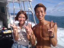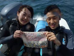こんにちはJackです^^☆本日2発目は、名古屋からお越しの素敵カップルです♪最初はミナミちゃんが少し緊張気味でしたがすぐに慣れてめちゃめちゃ楽しんでました!!ヒロシさんは初めてと思えないくらい上手でしたね!!正面の根をグルリしてクマノミと写真とって、ツバメの根まで泳いできました!!トモさんの「宇宙を感じよう!」をコンセプトに(笑)少し沖を無重力を感じながら泳いできました!!今日は透明度も良かったので気持ち良かったですね♪たくさんのヒトデやコクテンフグなどに遭遇♪記念撮影もバッチリしました!!ともさんの「2発芸」にも感動してましたね^^☆感想いただいたので載せます! ヒロシさん&ミナミちゃん:本日、初ダイビング!!!名古屋「から来ました。海ちょーキレイ☆魚うじゃうじゃ〜トモさんのバブルリングもすごかったです。また来たいです!! |