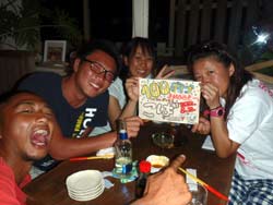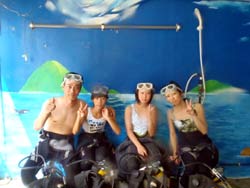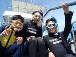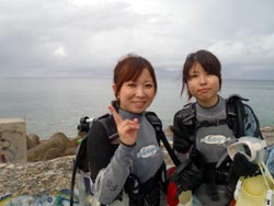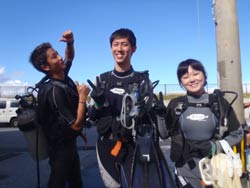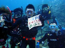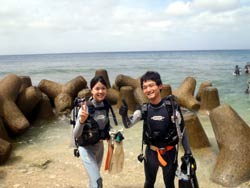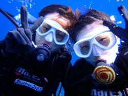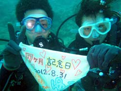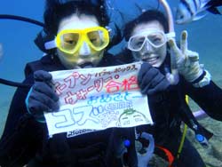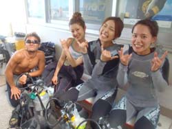 はいさ〜い、せーやです!!今日はやっと台風の影響がなくなりやっとみんなを海に案内できる事ができます^^今日一緒にダイビングしてくれたのは、石川県からお越しの女の子2人組み☆ゼニちゃん、こうらちゃん!2人とも初体験ダイビングですが、少し最初緊張しつつもお魚にエサをあげたりしているうちにだんだんリラックスすることができ楽しめましたね♪そんな2人から感想もいただきました!! |
