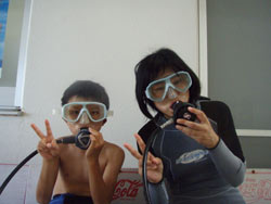 はいさい!今日はプチ体験ダイビングに参加の谷さん親子です。8歳のみおつき君はめちゃめちゃ上手くて耳抜きも問題なしでりくの説明でもバッチリでしたが、お母さんが少しドキドキして最初は呼吸をするのに困っていましたが、浅いところでの練習でばっちり上手くなりました。そこでニモに会いに水中でBコースへコースアップしました。耳抜きもばっちりだったので深い所で餌付けもしました。サンゴの畑も見に行きました。そんな2人のコメントは< お母さん「最初は恐かったです。慣れたらとっても気持ち良かったです。」 ミオツキくん「おもしろかったです」 |