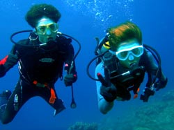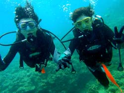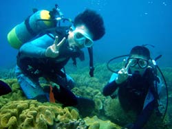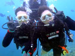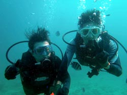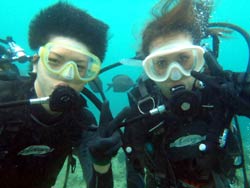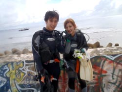 はいさい!!ひろあきです!!今日は早朝から体験ダイビングでぜっきーとぶっちーの美男美女の仲良しカップルと一緒に潜ってきました☆集合時間の1時間前に到着してくれた2人は気合もばっちりで誰もいない海に貸切ダイブでした☆2人とも初ダイビングとは思えない程の落ち着きようでとても上手に水中世界を楽しむ事ができました!!朝一だったので魚もたっくさん寄ってきてびっくりしてましたね(笑)今度はライセンスでもゲットしちゃってくださ〜い☆ 裕志さん「バブルリングすごかったです!!前世イルカって^^そーいやイルカっぽい顔かも!!」 トモヨさん「魚がいっぱいいて楽しかったです!ニモが可愛かった☆お兄さんがちょいちょい面白い事をしてくれるので笑ってしまいそうでした!」
