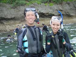 本日二組目は〜〜、飛び込み参加の新婚さんで〜す♪♪ダイビング経験アリの2人だったので練習もそこそこにして、もう早く潜りたくてしょうがないって感じでやる気満々でした(笑)海に入るときも、バックロールで綺麗に2人同時に入れました!!2人とも息ピッタリすぎて面白かった〜〜〜☆洞窟も一番乗りで満喫できたし、ガッツリ泳げて良かったですね(^^)最後に感想も載せておきます!! |
