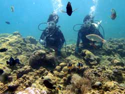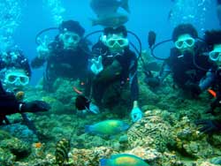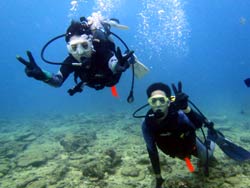 朝一で遊びにきてくれたのは元気いっぱいの女の子2人組☆初めてのダイビングで緊張気味だったけど全然、余裕で水中世界へ行くことができました!!水中ではたくさんのお魚さんに囲まれてすごく目がキラキラ光っていました♪人も少なかったのでのんび〜りニモと一緒に写真撮影したりやわらかサンゴのお花畑に癒されてきました(0^^0)2人ともとっても上手に泳げていたね!!そんな2人からのコメントです!! えみちゃん「魚がたくさんでかわいかった☆ニモのお家に不法侵入してごめんなさい^^口にずっとくわえていないと行けないのが辛かったけど、楽しかったです☆」 かなえちゃん「思っていた以上に器材が重くて水中でバランス取るのがたいへんだったけど、実際魚やサンゴと触れ合えていくうちに忘れるくらい楽しかったです。」 |