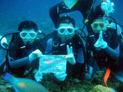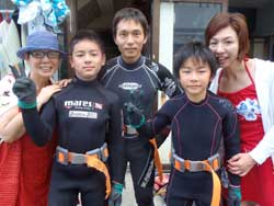 さーーーて今日ラストのお客さんは〜、昨日スノーケルで参加してくれた、なかぞのさん家族がダイビングに参加してくれました(^^)嬉しかったです♪参加したのは、お父さん&こうちゃん&ゆうちゃんの3人です。皆上手で、がっつり泳ぎました☆ほとんど自分で泳いでたし、写真とか動画もたくさん撮りました!!次回はライセンスに挑戦かな??笑)また来てね。最後に感想のせます。 なかぞのさん家族☆今日、初めてのダイビングでおもしろかったです。最初は水が当って恐かったです。でも水の中に普通に魚がいて触ろうとしたらすぐ逃げて面白かったです。それと海の中で空を飛んでるような感じがしたので面白かったです。 |