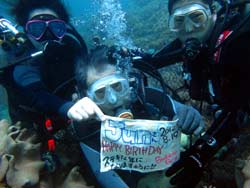 はいさい!台風接近中の沖縄からだよ!今日はいつも遊びに来てくれる、泉さんのお父様の体験ダイビングです。青の洞窟体験ダイビングに行きたかったんだけど、クローズなので砂辺お花畑でニモに会いに行きました。耳抜きの時にどうしても鼻から息を出せないので、丸秘テクニックを伝授です。その後はスムーズにばっちり出来るようになりました!!!!ニモと一緒に写真をとったりカマスの群れに突撃したり、家族写真をとったりとモリ沢山の内容でしたね。山登りや水泳をならっているだけあってスイスイと自分で潜る姿は、男でした。そんなジュンさんと皆でジュンさんの誕生日をお花畑でお祝いです。誕生日おめでとう。水中で写真もとりました。ジュンさん次回は洞窟へ行きましょうね。また遊びに来てください。そうそうサンゴ畑にはかなり感動されていましたね。僕達も嬉しいです。ではでは2本目泉さんとあっちゃんといってきま〜〜す。 |