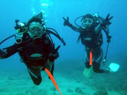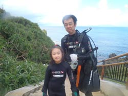はいさい!!浩明です!!今日は真栄田岬で体験ダイビングを担当しました!!遊びに来てくれたのはじゅんちゃんとようこちゃんの仲良し姉妹のお2人です☆エントリーの時間帯はけっこう波があってハードなコンディションでしたが2人ともとっても上手に海にエントリーしてあっという間に水中で人魚のようにスイスイ泳いでいました^−^洞窟の中も貸切状態で青の光をたっくさん見てきましたよ〜☆ お2人からの感想は!! ようこちゃん:とても親切に教えて頂いたので初めてだけど安心してできました。キレイな海の中が見られていい思い出ができました。ありがとうございます。 じゅんちゃん:人魚気分だった。たのしかったー。ひろちゃんありがと。 |