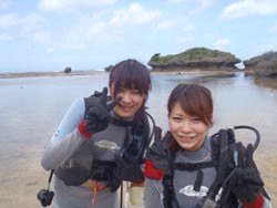 はいさ〜〜い、せーやです!!今日は天気最高、元気も出ちゃいます♪一緒に潜ってくれたのは、東京都からお越しのミヤちゃんとキャサリンのカップル2人です!!海は穏やかでしたが、満潮時だったために足をつけてゆっくり練習ができずちょっと緊張していましたが、顔をつけているうちにドンドン上手に!!洞窟までひとっ飛びで行ってきましたね♪2人から感想もいただいています!! 宮ちゃん「海の中がとってもきれいで楽しかったです!!」 キャナエ「最高でした!!輪。感動しました!!またきます!!」 |
