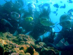 はいさ〜〜い、せーやです!!午後の最後の時間は前半まさかの大雨!!埼玉からお越しの川村さんと福島さんのお2人が元気に遊びにきてくれました^^実はBBによく遊びに来てくれる渡辺のなべちゃんと同じ仕事場の方だったんです♪2人は初ダイビングでしたが、最初に少し耳抜きに苦戦したぐらいであとは上手に泳いでいましたよ〜〜☆魚も多くめっちゃ喜んでいましたね!そんな2人から今回の感想もいただきました。 |