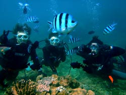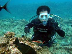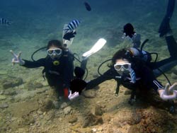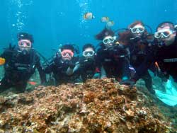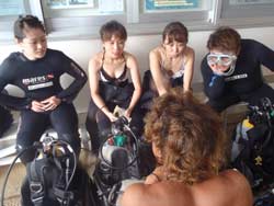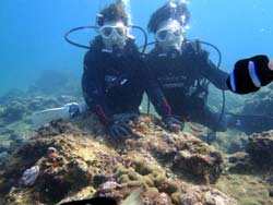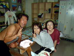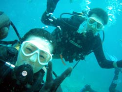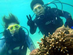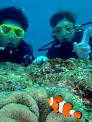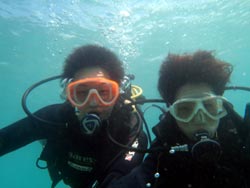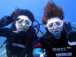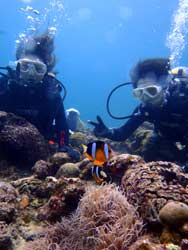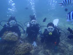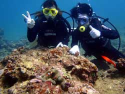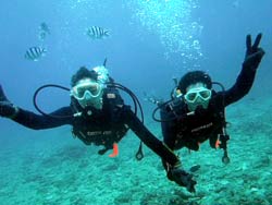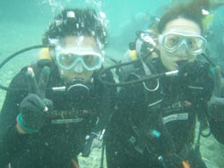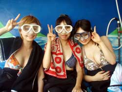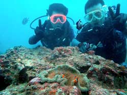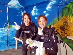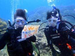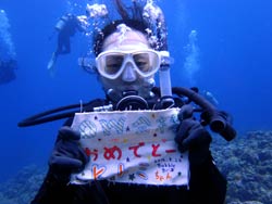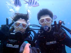 本日二組目は、同じ職場の仲良し女子2人が参加してくれました☆ケンちゃん&るみす の2人です(^^)緊張しかしてなかった感じだったけど、案の定ケンちゃんはプチパニック(笑)でも無事に潜れて、ガッツリCコースで遊んできました!!!マスク顔最高だったよ〜〜(爆)エサあげビックリしてたり、サンゴさわりまくってたね(笑)ニモにもキスされたしね!!写真いっぱい撮ったから見てみてね〜〜☆じゃ2人からの感想も載せますよ〜〜。 るみす&なりす:初めてのダイビング。わくわくして、緊張もしてたけど、親切に教えて下さり、たのしかったです。魚がいっぱいいました。サンゴも初めてさわりました。お兄さんのバブルリングすごかったです。ほんとに楽しい思い出いっぱいになりました。また遊びに来たいです。 |