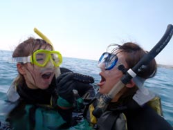 はいさい!!午後から遊びに来てくれたのは関東から遊びに来てくれた美人姉妹のあやちゃんとゆいちゃんのお2人とエンジョイ体験ダイビングで潜ってきました☆2人はダイビング二回目ということで心配だった耳抜きも順調に行きあっという間に水中7m〜8mまで!!海のアイドルニモに挨拶してたっくさんの魚に餌付け!!お昼時だったので!?魚も顔を覆いつくす勢いでエサをバクバク食べてくれました^−^水中でもマスク越しにとってもいい笑顔をくれたお2人からのコメントです☆ |