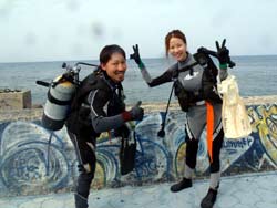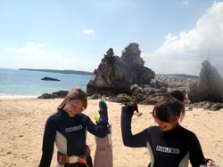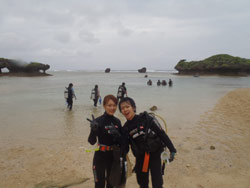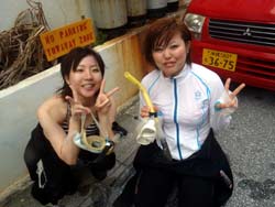 はいさーーーい!!タクです。台風通過しました〜〜(^^)さっそく体験ダイビングに行ってきました〜〜☆今日は大度浜海岸です。今回参加して下さったのは、ユウちゃん&すぎちゃんの2人です。初めてのダイビングで、すぎちゃんはド緊張(笑)練習は難無くこなしてたので、自信を持たせていざ出発!!浅瀬でたくさん練習して、ガッチガチだったけど途中から笑顔出てました!!良かった。2人とも上手だったので、次回は青の洞窟リベンジしましょうね。最後に2人から感想です。 ユウちゃん&すぎちゃん☆最初は自分が潜れるか不安でいっぱいだったけど、スタッフの方がとても親切、丁寧に教えてくれたので、楽しんでダイビングすることが出来て良かったです。またやりたいと思いました! |