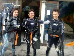 こんにちはJackです^^☆本日、体験ラストは広島からお越しの3名です!!タカシさん・ヨウヘイさん・ユウイチさんです♪タカシさんは以前にもバブルに遊びにきてくれていたようで、久しぶりのダイビングです!!ヨウヘイさん&ユウイチさんは初のダイビング!!ユウイチさんは緊張しまくりで自分で爆笑してました(笑)ヨウヘイさんは初めてなのに、とっても落ち着いていて上手でしたね♪まずは、ゆっくり泳いでニモのところへ♪ずっとイソギンチャクに隠れてなかなか出てきてくれなかったです^^;イソギンチャクもちじこまってましたね(笑)サンゴ畑では、少し揺れていましたが、サンゴに触れてみたり、初めてのソフトコーラルの感触にビックリしていました♪後半は手を離して泳いでみたり餌付けしたり色々遊んで帰ってきました!!最後に感想載せます!! タカシさん☆本日は、どうもありがとうございます。少し寒かったですけど、すごく楽しく泳げました。次に来る時もバブルボックスです。 ヨウヘイさん☆本日は、どうもありがとうございました。思っていたよりも楽しかったです。今度はライセンスGETしにきます。 ユウイチさん:ありがとうございました。まさかの出来事でした。ニコ☆ |