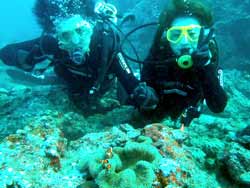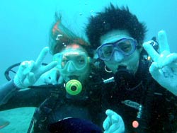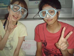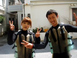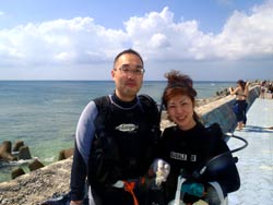 本日ラストのゲストは急遽紹介で遊びに来てくれたようちゃんとみさきっくのお2人です☆2人ともスノーケルは何回かやった事があるとの事でしたがダイビングは初めて^−^最初は緊張していたみさきっくでしたが練習を重ねるとだんだんと水中に慣れてくれて水深8mまで潜ってニモに挨拶することができました☆一発芸も決まって魚にエサもあげてきましたよ〜☆また沖縄に来たら海遊びしてくださいね★ ようちゃん:シュノーケリングは数多くやってきたので、おかげですぐ慣れることができた。インストラクターのプロフェッショナルな動き、彼女を安心させてくれてありがたかった。途中ノドがカラカラ、ゲロ吐く感覚になったが大丈夫だった。よかった、よかった。 みさきっく:しょっぱなからパニックになり、あきらめる気マンマンでしたが、ヒロポンが上手におちつかせ安心させてくれたおかげで最後まで最後には楽しんで無事陸に戻るコトができました。本当にありがとうございました。もっとまたやりたいです!!ステキな新婚旅行になりました。 |