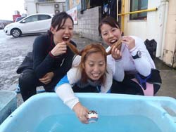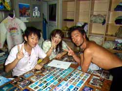 タクです!二組目です!!飛び込み参加で来てくれました!!!東京からお越しのなっちゃん&なっちゃんです(笑)なんと今日帰りだったので、ちゃちゃっと練習していっぱい泳いできました(笑)ナマコの内臓がくっついたりして盛り上がったね〜〜フフフ・・・。一発芸もキレイに決まったね!!エサあげもビビリながら楽しそうにやってたね。次はデカイ魚でも大丈夫じゃないかな??笑)さて最後に、感想のせます。 なっちゃん&なっちゃん☆タクちゃん、短い間でしたが、親切にありがとうございました!!また次来た時は、ダイビングしたいです。ウェットにナマコの内臓が付いてました・・・笑 すみません(汗)またオキナワ絶対来ます!!楽しかったです♪ありがとうございました。 |