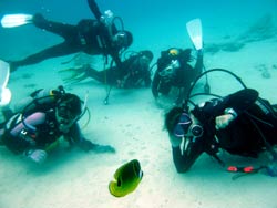 まいど!!ひろあきです!!今日は飛び入り参加で遊びに来てくれた、ガミ・ザキ・ヒデさんと砂辺で体験ダイビングで潜ってきましたよ〜☆☆ザキとガミは初ダイビングに挑戦でしたがみんなとても上手に水中世界へエントリーできました^−^まずは砂辺のニモにご挨拶♪みんなで一緒に記念撮影をして砂辺のお花畑を見るためにちょっくら遠泳☆みんなフワフワのソフトコーラルをさわってご満悦でした☆3人からのコメントです! |