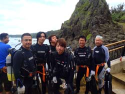 はいさ〜いひろあきです☆^−^今日は久し振りに真栄田岬が穏やかになったので真栄田岬で体験ダイビングを担当しました!遊びに来てくれたのは僕の地元の友達、2年前くらいも遊びに来てくれて今回は社員旅行で青の洞窟体験ダイビングが6名と青の洞窟シュノーケリングが8名の大人数でワイワイ楽しんできました!!経験者の方も初めての方もすんなり潜ることができました。洞窟の中はちょうど貸切状態!!じっくり青の光をみんなで観察することができました☆エキジット前には大量の魚に餌付け!!今日も色とりどりの魚がエサをパクパク食べに来てくれましたよ〜☆また沖縄に遊びにくる機会があればダイビングやシュノーケリングで海遊びしましょー!! |