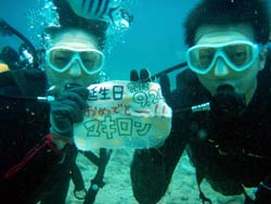 こんにちはJackです^^☆本日1発目はぁ〜関西からお越しの素敵なカップルです!!ふーみん&まきろん☆2人ともスラッとしていてモデルさんみたいでした!!2人とも初めから上手でスムーズに入れました、途中マキロンが耳抜きに苦戦してましたが、それ以外はなんの問題もなく、ゆっくり、たくさん泳ぎました♪まずはニモに会いに!!やっぱりいつ見てもカワイイねぇ〜^^お花畑もゆっくり泳いでサンゴと戯れてきました!!どこまでも続くサンゴ畑はキレイだったね!!バッチリ写真も撮って、自分で泳いでみたり、魚に餌付けしたり、そして!!今回のメインイベント!!Happy Birthdayまきろん!!!今日24日に21歳の誕生日を迎えたマキロン♪水中でお祝いをさせていただきました^^☆これからも2人仲良く♪素敵な誕生日を…☆感想頂いたので載せます!! ふーみん:今日、初めてのダイビング!ジャックと周りのイケメンお兄さんに色々教えてもらえたので楽しくできましたー!!想像以上にキレイで本当に感動しました!素敵な時間をどうもありがとう! まきろん:☆ジャック☆イケメンお兄さん☆今日は素敵なダイビングをありがとう☆ニモも見れたしサンゴもキレイやったしサイコー!!!バブルリングもすごくキレイ!感動☆ビックリサプライズもあったし、一生忘れない21歳の誕生日になりました☆またきます☆ありがとー!!! |
