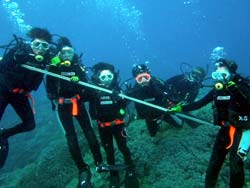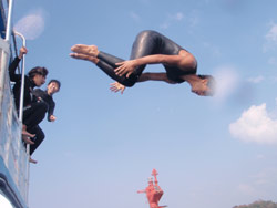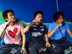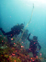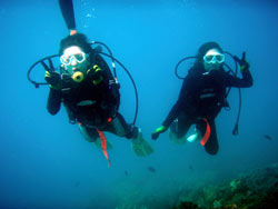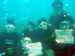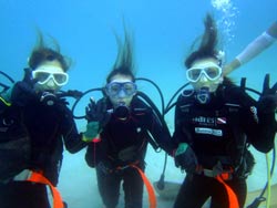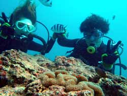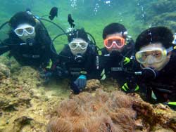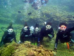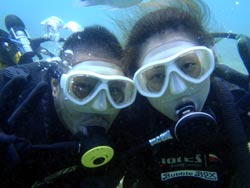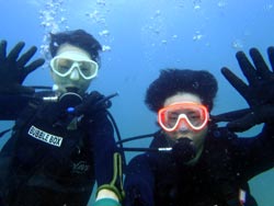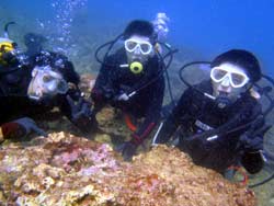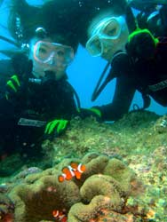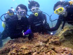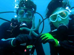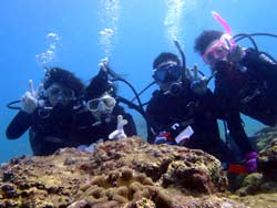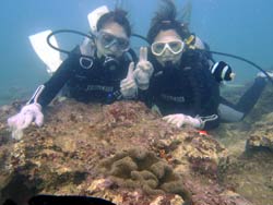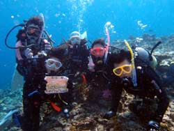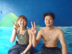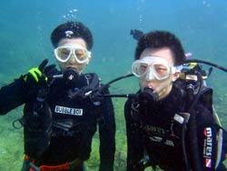 こんちわ!タクです。今日は砂辺で体験ダイビングです。まず初めのゲストさんは〜、ダイビング初挑戦のユカちん&じゅんちゃんです。ドギマギしながらの練習でしたね(笑)海に入るときは、ユカちんが最高潮に緊張!!ま、無事に潜れて何よりです(^^)カッパさんの一発芸も見事でしたね♪練習しといて(笑)さて最後に、2人からの感想です。 ユカちん&じゅんちゃん★最初はすごく怖かったけど、海の中は本当にキレイで楽しかったです。カクレクマノミのあいさつ超かわいかった!!初めて会った人をこんなに信用したのは初めてでした。タクさん、カッパさん、ありがとうございました。 |