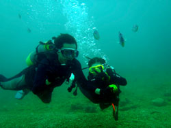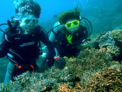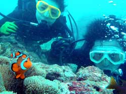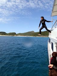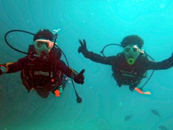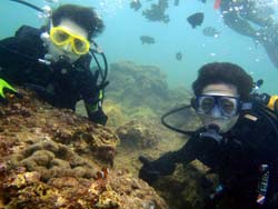 さてさて続いて二組目です。徳島からお越しのミッチー&よっちゃんのお2人です。最初から最後まで上手でした(笑)サンゴ触ったり、ニモにキスしてもらったり、ヒトデ顔に乗っけたりして遊び尽くしました(笑)最後も2人で自由に泳いで、ちょっと違うところに泳いで行っちゃったりしたね〜〜(笑)とりま潜れて良かった!!!最後に感想をのせます。 みっちー&よっちゃん☆初めはドキドキ緊張してしまい、案の定もぐり始めは呼吸方法を忘れパニックしましたが・・・。パニックが収まってからは、満喫して魚にエサあげたり、サンゴ見たり、すっごく楽しかったです!!なんといっても、浅瀬から深い所へ移動した瞬間・・・あの景色は最高!! |