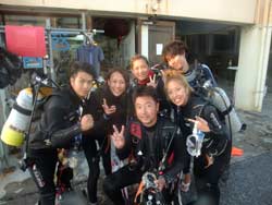 はいさい!!本日飛び入り参加で遊びに来てくれたのはみきちゃんとあやかちゃんのお2人です☆2人とも初めてで、申し込みの時から「わたし泳げません!!」っと豪語していましたが、最初は穏やかな所で練習!!おっ意外と行けそうって感じで沖までいきましたが寒さと酔いにやられて・・・((笑))浅いところとわかれて潜ってきました^−^今度はまた暖かい夏に遊びにきてね!!待ってるよ〜☆ みきちゃん:怖かったよ(泣)浅いところだったけどいっぱいキレイな魚が見れて良かった!あとお兄さん優しくしてくれてありがとうございました!また〜!! あやかちゃん:初のダイビングで不安いっぱいだったけど優しく教えてもらって楽しくすることが出来ました。魚と一緒に泳ぐことが出来て本当に楽しかったです。 |