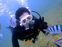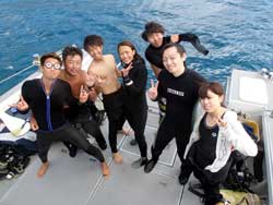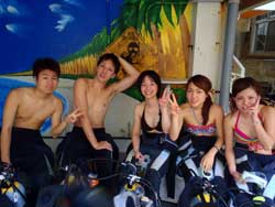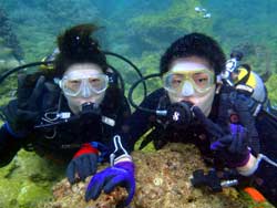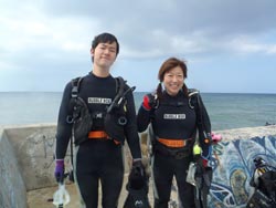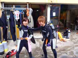 はい、タクです。本日二組目は、今年の4月にも来てくれた方がまた遊びにきてくれました(^^)今回はお友達を連れてきてくれました♪♪あだ名はよっちゃん&ゆっきー。ゆっきーは初めてダイビング。練習してたら、だんだん暗くなってきて不安しまくりでしたが、なんだかんだで潜れたので楽しんでて良かったです。また半年後?かな??写真見ながらニヤニヤして、また遊びにおいで〜〜(笑)待ってるよ!最後に感想載せます。 ゆっきー&よっちゃん☆台風の後でどうなるかと思ったけど、無事ダイビングできて良かったね。頑張ってFUKUOKAから来てよかったー!!お魚かわいすぎ☆次こそリベンジ青の洞窟やね。タクちゃん、また遊びにくるけん待っててねー。二人で来れて幸せでした。 |