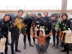 はーーいせーやです!!今日は台風過ぎてからの最初のボートです。でもやはり道中ウネリが大きいことといったら、、、、。久し振りのボートだったのか自分も少し酔ってしまいダウン^^でもそんなのに負けじとスーツに着替えて波と風に当たりながら元気充電☆とりあえず今日は北のウネリが大きいため座間味のトウマ・ドラゴンレディー、渡嘉敷のアリガーケーブルまさに冬の第三角形で潜ってきました!一緒に潜ってくれたのは、ダイブマスターのひとしさん、たかゆきと自称アシスタントの西おっち、今上海で仕事をしていてしかも婚約が決まったタケちゃんとお相手のみっちーと最後自称レスキューダイバーの今日がほんとにラストのゆうりさんの全員で7名で潜ってきました♪今日はやっぱり透明度があまりよくなかったんですが、天気だけはよくそれがみんなのテンションをあげてくれました!全部砂地ポイントなので砂地に隠れた生物を見つけてはみんなで写真やらいじめやら♪今日はひとしさんが300本記念ダイブなのでゆうりさんが最後のガイドをケラマから帰ってきた後に砂辺で潜ることに♪ひとしさんおめでとうーーーーー^^ついこの間、OWの講習をしたと思っていたのにあっと言う間に300本!!ゆうりはびっくり!!そしてとっても嬉しいです(0^^0)300本までの間に色々あったね☆本当に楽しくて本当にひとしくんに出会えて良かった!!これからも沢山の人たちと素敵な思い出作ってね!!楽しい時間をありがとう!! ゆうりへ★ |