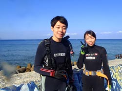 どーもー!タクです。今日は砂辺で体験ダイビングです♪今回のゲストさんは、愛知からお越しのご夫婦です(^^)ミホちゃん&たいっちゃんです。昨日もダイビングをしたしたそうですが、不完全燃焼だったそうで、がっつりCコースで存分に遊んできました!!海はすこし不機嫌で波が立ってましたが、2人ともぜんぜん余裕だったのですんなり海へ入れました☆深いところまでいって、自分で泳いでみたり、ニモからキスしてもらったり・・・それにしてもユラユラしてましたね(笑)それだけ余裕だったら、次回はライセンスかな〜〜?待ってますよー!!!さてさて2人からの感想です。 みほちゃん&たいっちゃん☆今日は、体験ダイビングCコースで、お世話になりました。波が高くてユラユラしてましたが、スタッフの方がしっかりサポートしてくれたので、楽しむことができました。特に、ニモのキスやサンゴのお花畑に感激しました。色々とありがとうございました。 |