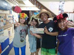 はいさ〜〜い、せーやです!!今日の最後の時間はお店の目の前でシュノーケルに行ってきましたよ♪一緒に泳いでくれたのは、高宮ママとあいりちゃん、空ちゃんと海君の4人と行って来ましたよ!行く前に雲からの太陽がきれいで天使が降りてきそうな空だったね☆3人ともやんちゃなので水中もすごい動き回ってバンバン泳いでたね。やわらかいサンゴ触ったり、魚にエサあげたり、クマノミをみんなで眺めたりしたね〜〜!そんな沖縄の海の感想をいただきました! 愛里ちゃん「沖縄の海はキレイで魚がいっぱいいた!魚で一番きれいだったのは、ルリスズメダイがよかった。シュノーケルが面白くて息が吸えていっぱい見れてよかった。」 海君「沖縄の海は一番きれいだった。魚がいろんな種類がいて面白かった。」 空ちゃん「沖縄の海は、カクレクマノミがいてすごくかわいくてすごいきれいだった!!しかも海キレイだった!すっごい気持ちいいサンゴもあって何回も触ってすごい気持ちよかった!それ以外にもすごいきれいな魚もいていろいろいてきれいだった!またシュノーケルしたい☆」 |