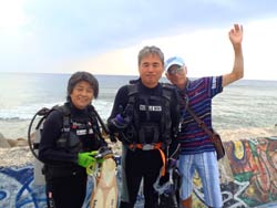 今日は親子での参加が多いですね^^10時半からはお母さんのマサコさんと息子さんのりょうくんです!!予約は青の洞窟コースだったのですが、海洋状況が良くなかったので大珊瑚コースに変更になりました!!マサコさんは最初潜るまでに少しだけ時間がかかってしまったけど、最後は周りのサンゴ・魚を見れるまで余裕になっていましたね。りょうくんも魚とサンゴに喜んでもらえて良かったです。大珊瑚コースもキレイでよかったでしょ?次回は青の洞窟に行きたいですね!是非また遊びに来て下さいね!! りょうくん:初めてダイビングをしました。たくさんの魚を間近で見る事が出来て楽しかったです。またやりたいと思います。 まさこさん:初めてで心配でした。最初1・2m位の所で胸が圧迫された感じで潜るのは無理とあきらめていましたが指導者の内藤さん(しんさん)の上手な指導で無事潜ることが出来ました。沢山の魚にエサも上げることも出来良い思い出となりました。水中ワッカも良かったです!また、家族こようと思いました。ありがとうございました。 |