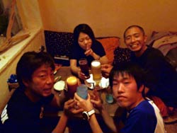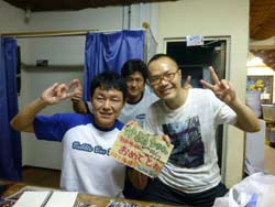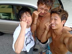 はいさーい!!台風とすれ違いでやってきた、社会人の240だよーん! 今日のパーティを紹介しましょう。一本目はひとしくん、かずちゃん、たかゆき、ともじ、たく。台風通過後、砂辺誰よりも最初に冒険してきました。いや〜、やっぱり地形変わってましたね。もじゃがもじゃじゃになってたね。そんな中、ニモは生きていました。この辺のショップの人々は一安心。二本目は渡辺さんをパーティにくわえて崎本部にいる、岩ゴリラを退治してきたぜ!!予想以上におだやかで、透明だったから楽勝でした。中ボス、コブシメをみんなで囲んでフルぼっこ。へコアユも皆で囲んだらヘコヘコしてたね。三本目もなんやかんやしてカエルアンコウみたりしながらエンドロールを迎えました。ボーナスステージとして、マックへ寄り道して帰りましたとさ。 |