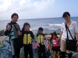 はーーーい、せーやです!!今日も砂辺の海にシュノーケルしてきましたよ^^一緒に泳いでくれたのは、栃木県からお越しの天野さんファミリー☆今回ママと一番下の女の子は陸でお留守番していてお父さんと長男格くんと次男幹士くんの3人とソフトコーラルのキレイな海で泳いできました^^格くん、幹士くんは初めてのシュノーケルで、少し戸惑っていましたが海に行くとテンションMAX☆分からないなりに少しづつ泳ぎ方や水での動きに慣れていったね!!浅瀬には色鮮やかな青やら黄色、いろんな形をした魚がいたね^^餌付けもしてたら魚達がわんさか集まってきてそれを捕まえようとみんな必死でしたよ〜〜!!そんな沖縄の海の感想を子供達からいただいましたよ。格くん「エサを手で持ってたらいっぱい来てくれたので、とても嬉しかったです。ルリスズメダイに願い事をして叶うといいです!」幹士「魚が多くて泳いでキレイでした。僕はカクレクマノミを捕まえたかったです。虹色のけっこう触れてよかったです。僕は他にもたくさん見つけました!」 |
